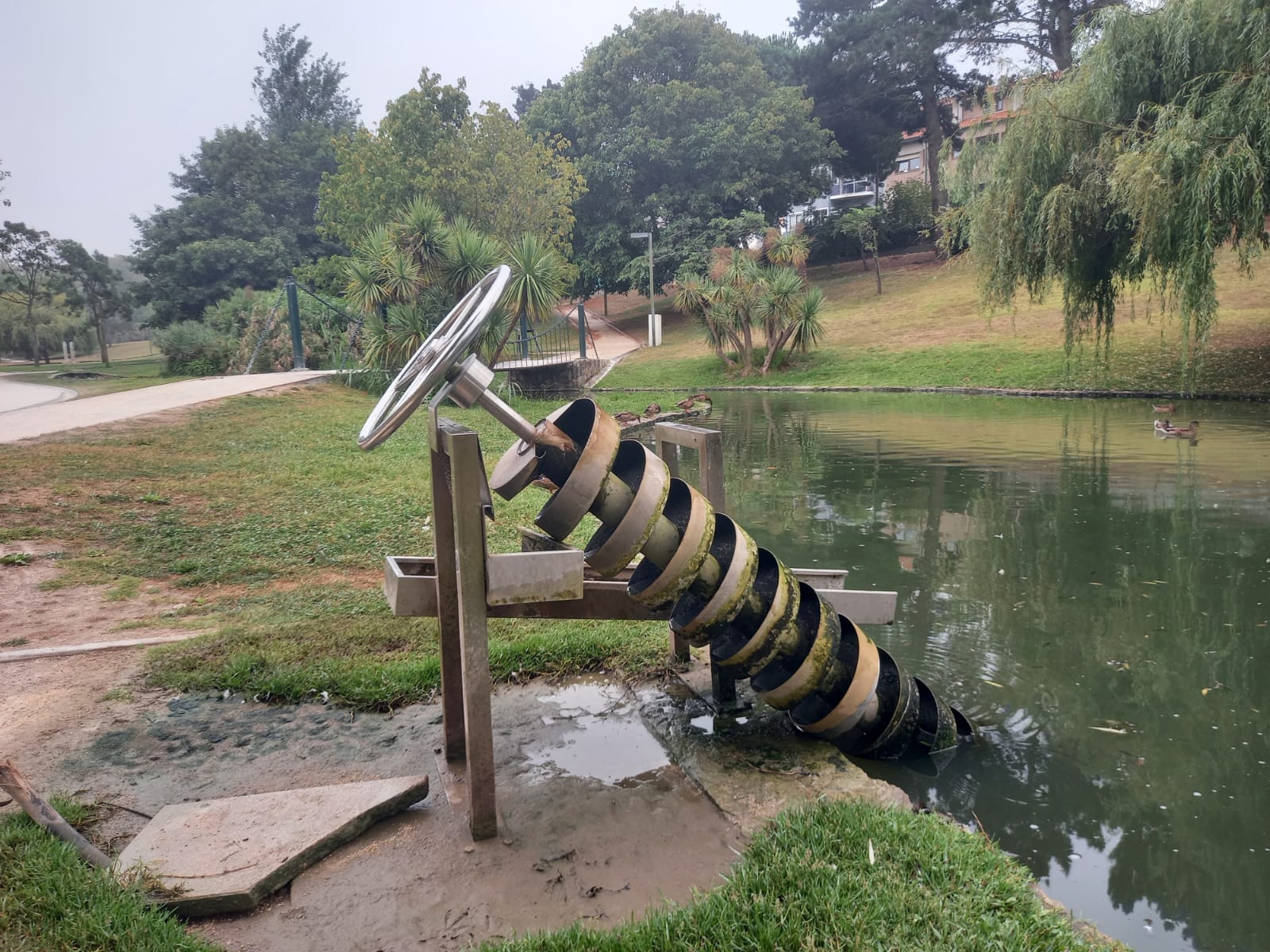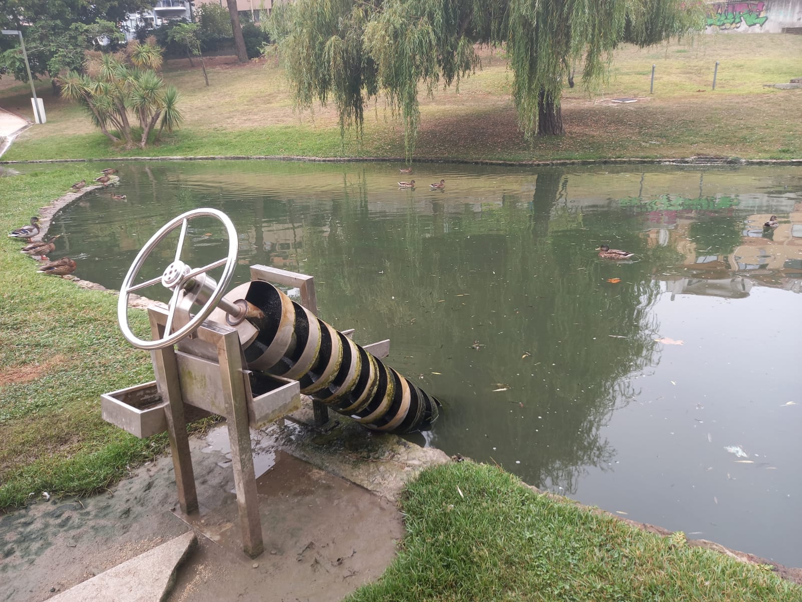 En un extremo del lago, al final del Parque da Baixa de Santo António de Aveiro (Portugal) nos encontramos esta maravilla de la tecnología. Si la grandeza de un invento se mide por su utilidad, este es de los más grandes, y si no que se lo pregunten a quienes tenían que subir a la espalda los cántaros de agua de los ríos. Basta con girar la rueda superior para hacer ascender el agua por el artilugio y recogerla a la altura del usuario. Todo ventajas: sin cargar, ni accidentes, ni manchas, ni mojaduras. No tiene ni un cartel de presentación, ni instrucciones de uso, está allí, entre columpios y barras de gimnasia, esperando a ser descubierto.